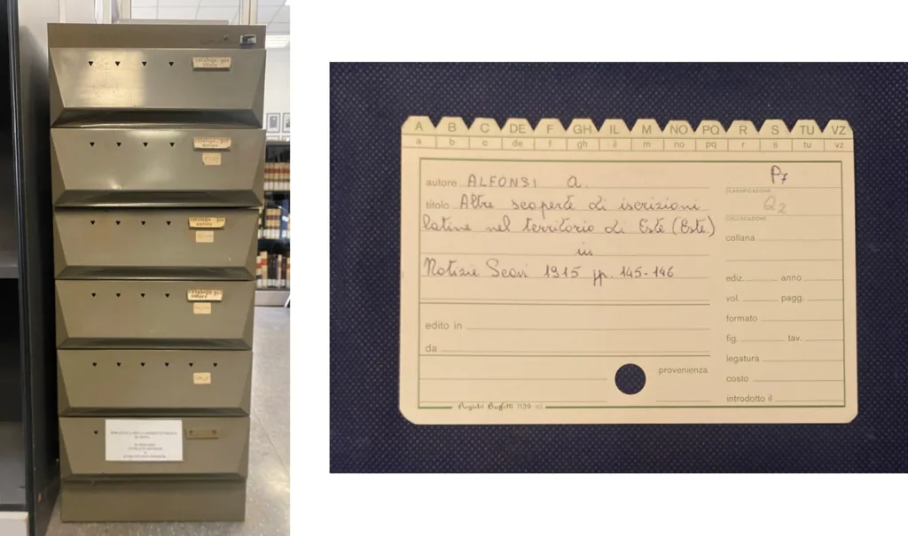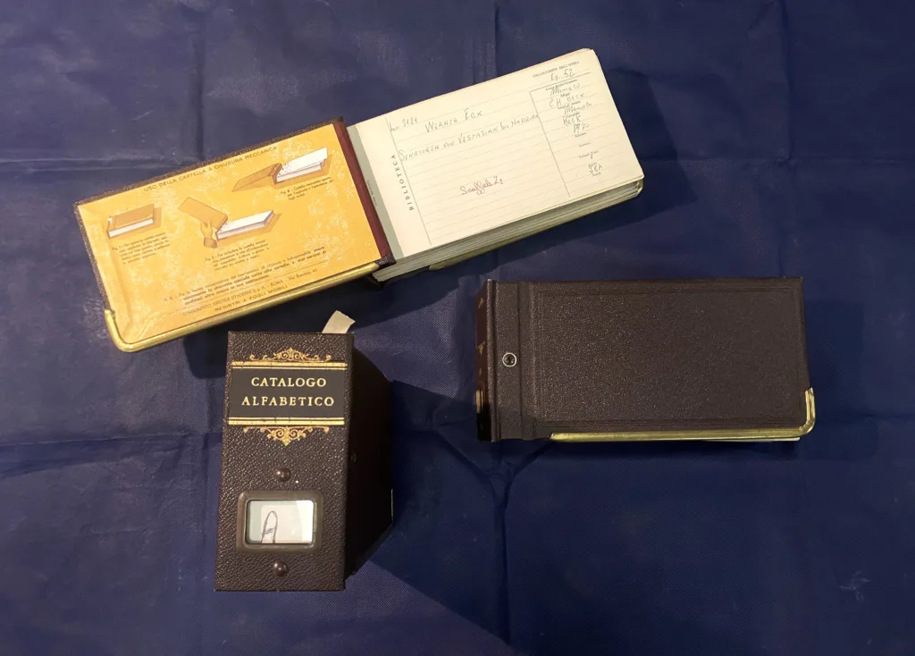 Oggi il catalogo della Biblioteca è totalmente digitale (https://biblioteca.scaviostia.beniculturali.it/), ma lo schedario cartaceo viene gelosamente custodito sia come memoria storica, sia come supporto alla ricerca in caso di guasti dell’infrastruttura informatica.