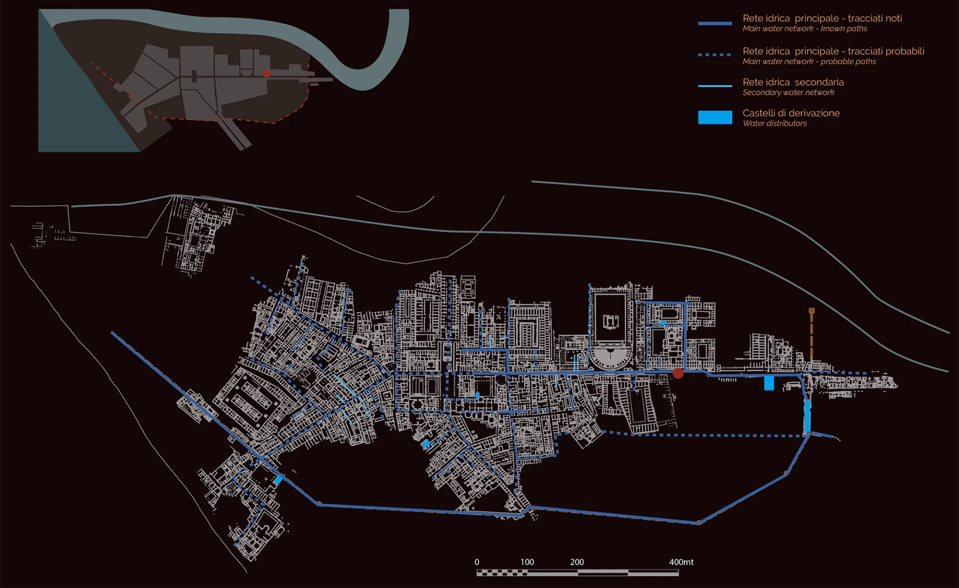 From here, the water was distributed throughout the city by an extensive network of cisterns and lead pipes (fistulae), inscribed with the name of the colony or of the concessionaries.