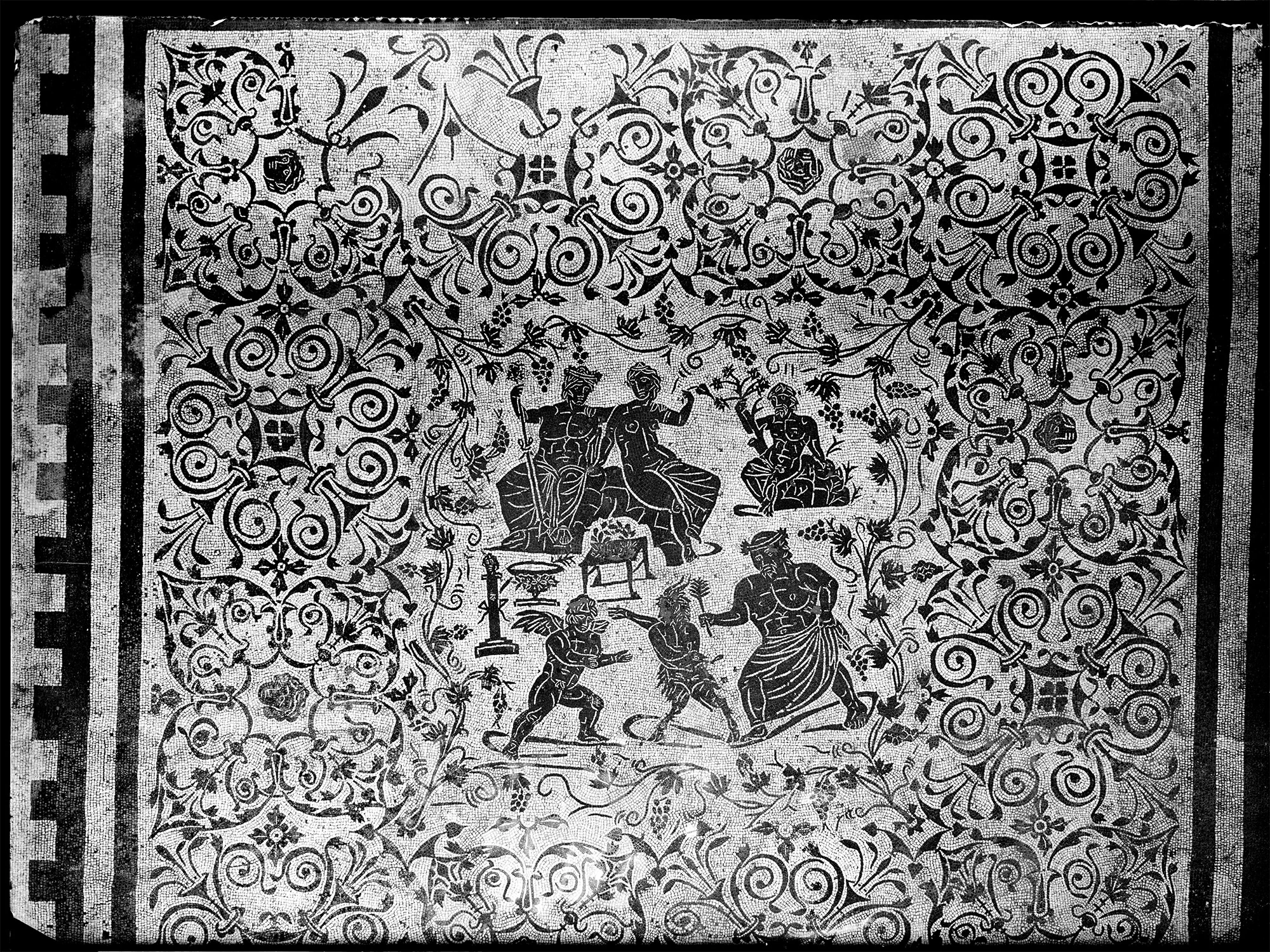 The vast hall (D) adjacent to the latter room is embellished with a mosaic floor with a complex figurative scene, representing Bacchus and Ariadne watching a fight between Eros and Pan (symbolizing love and lust respectively).