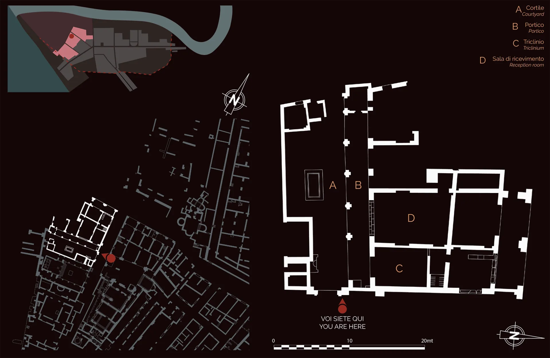 It has a large courtyard with a pool at its centre (A) and a portico on the north side (B) with several rooms opening onto it: they include a dining room (C), whose mosaic floor has plant motifs and birds in its central sector and, in the space between the couches, the head of Medusa between small winged figures.