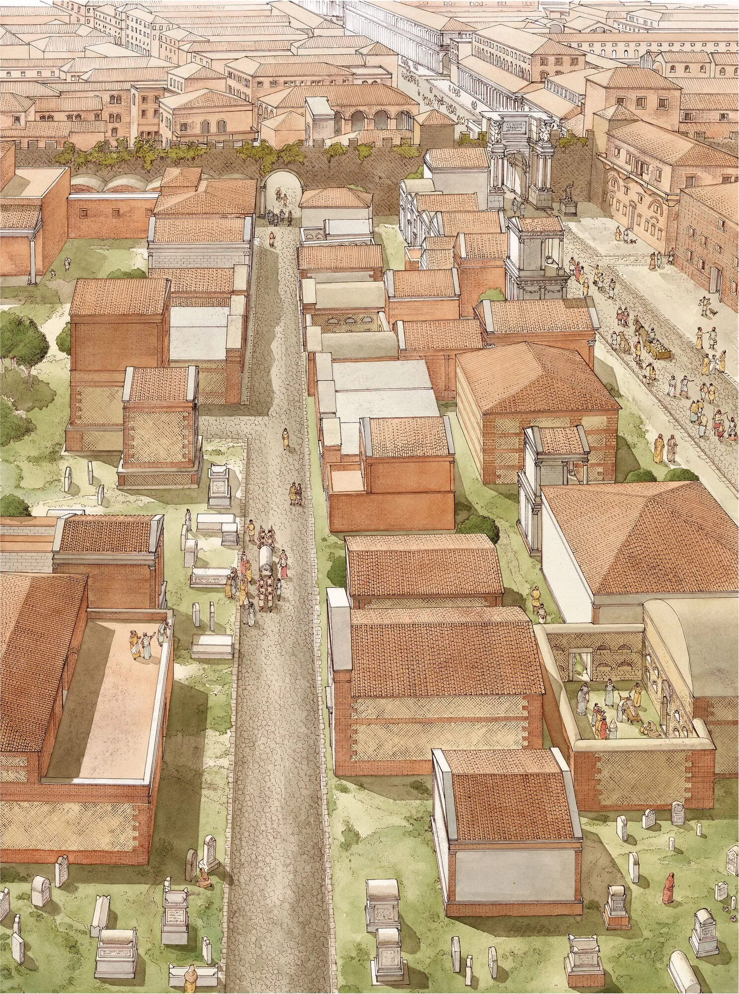 Starting from the 2nd century BC, tombs of various types began to be built on the south side of the Via Ostiensis outside the city, gradually increasing in number to occupy increasingly large areas and sometimes superimposed on one another. There are no tombs on the north side of the road because the strip next to the Tiber was considered public land. The first funerary monuments were open-air enclosures in which cremations took place; later, columbarium tombs were built with cinerary urns placed in small niches along the walls. Between the 2nd and 3rd centuries AD, burial prevailed: the deceased were placed in terracotta or marble sarcophagi, but also in simple graves dug into the ground and covered with tiles. Based on the surviving inscriptions, we can identify magistrates and prominent individuals from Ostia among the owners of the sixty or so funerary monuments found in this area.