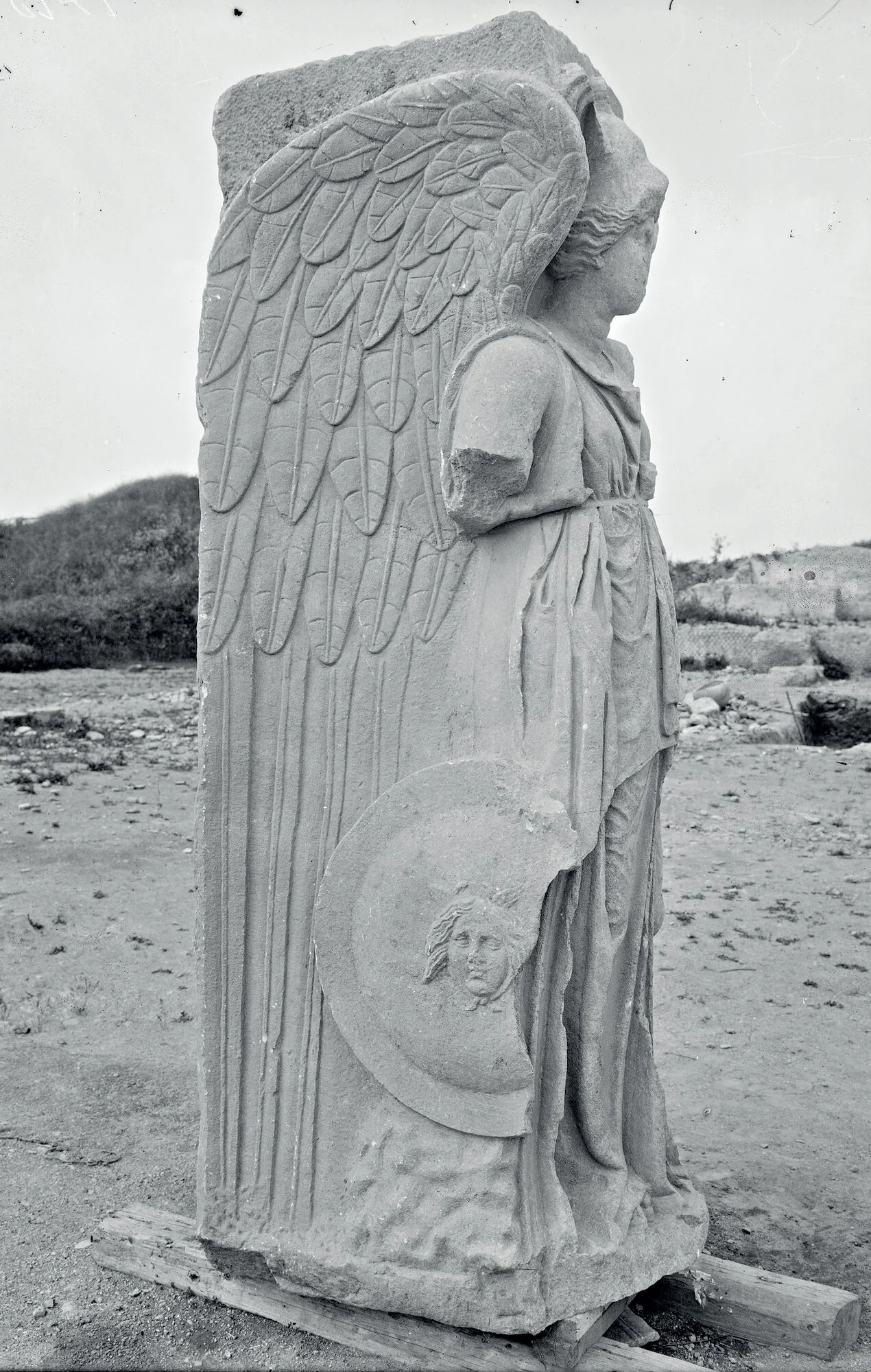 The gate was built of tufa blocks covered by a marble decoration that still survives in part. On either side of the gate, on the front of the attic, was an identical inscription commemorating the construction of the walls, flanked by statues of Minerva-winged Victory; one original statue survives and is in the Museo Ostiense whilst a copy can be seen in the adjacent square.