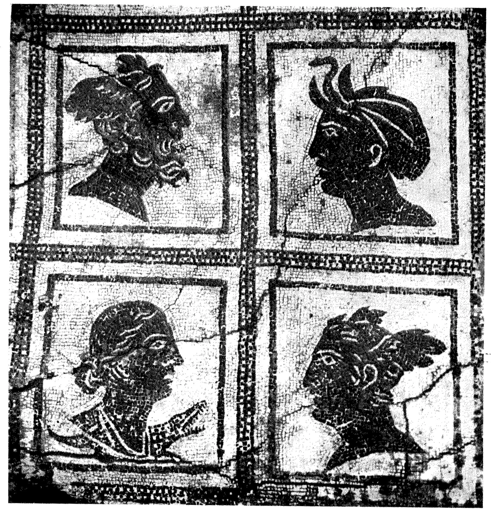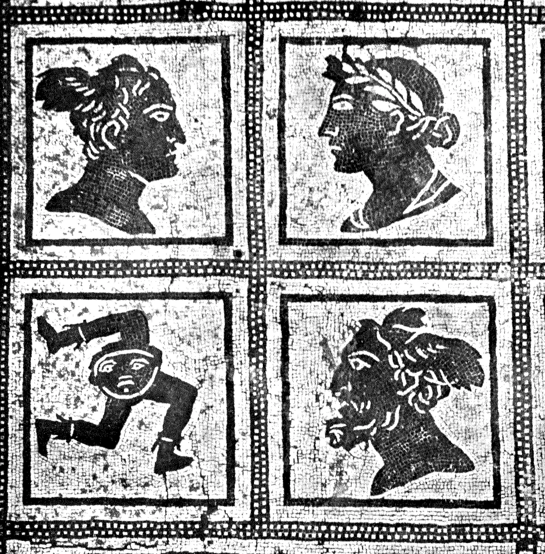The only portion still visible is a fine black and white mosaic presenting panels with depictions of weapons and geometrical motifs enclosed within a meander border.