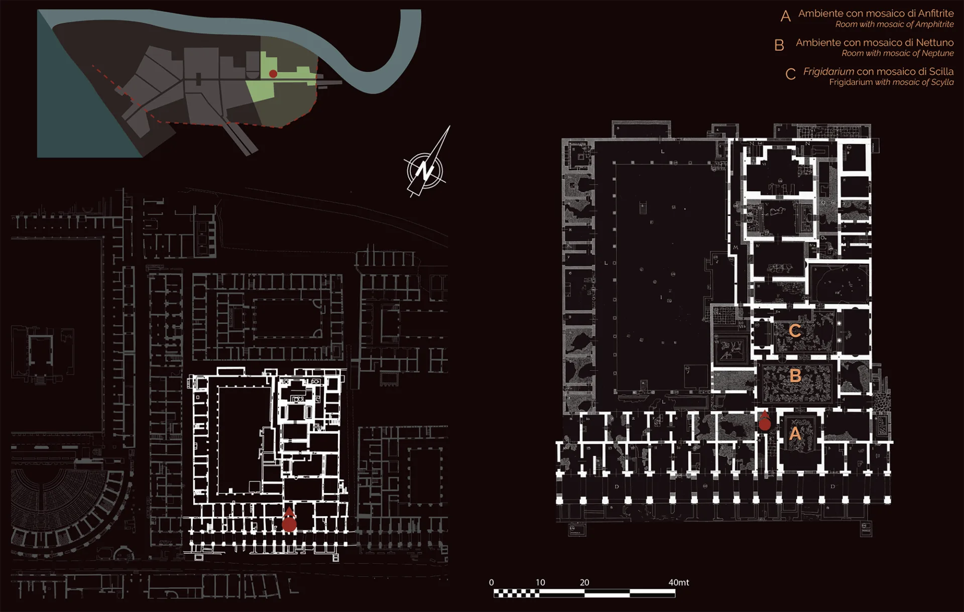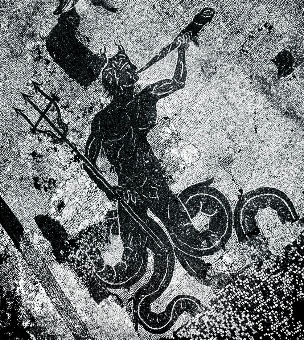 The frigidarium (room for cold baths) (C) was also paved with a mosaic depicting Scylla, the monster who killed seafarers, surrounded by marine deities.