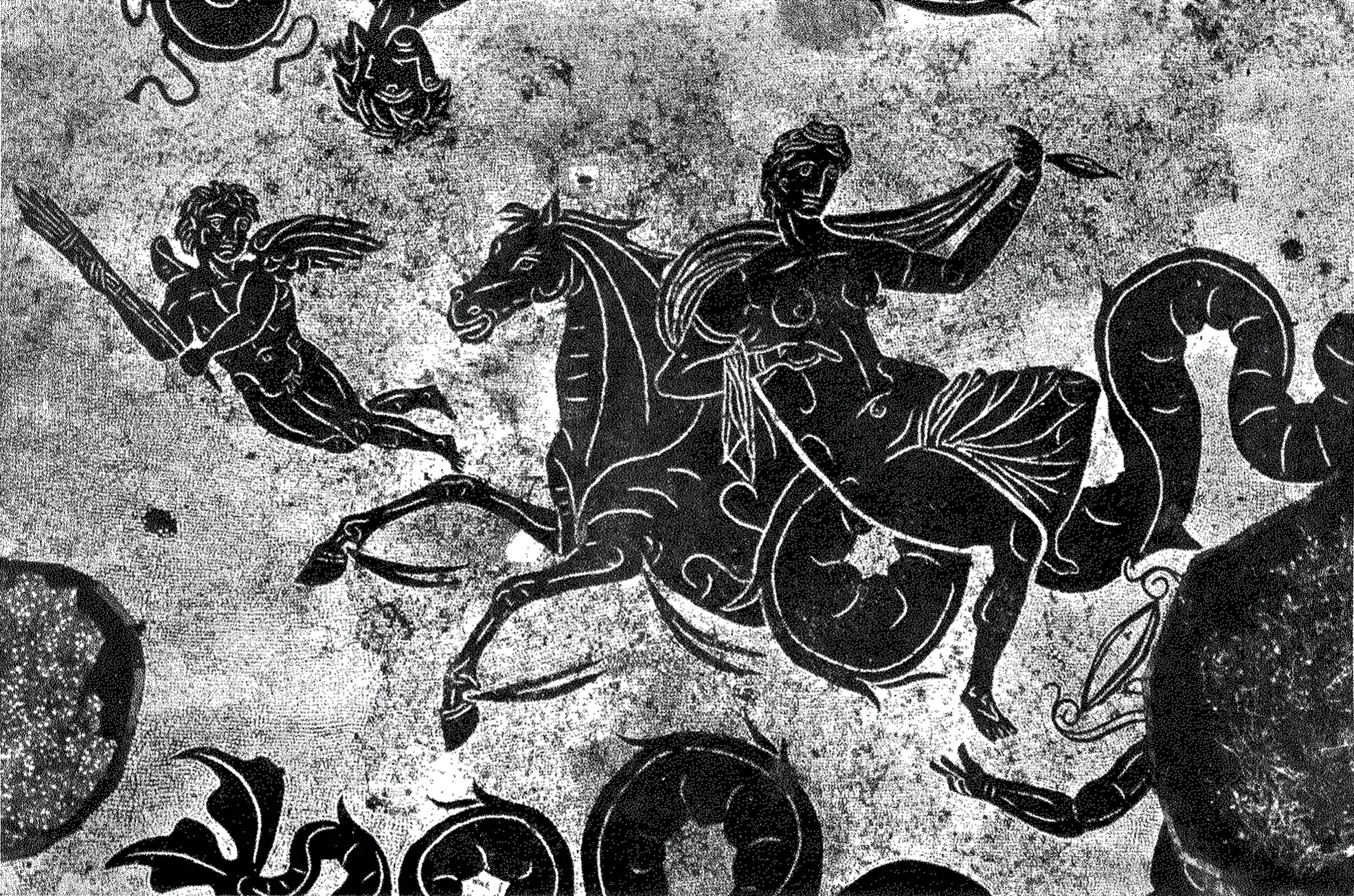 The first room (A) shows Amphitrite, Neptune’s wife, riding a sea horse and accompanied by tritons; in the second room (B) is Neptune himself with a trident, driving a four-horse chariot drawn by sea horses, surrounded by dolphins and tritons blowing on shells.