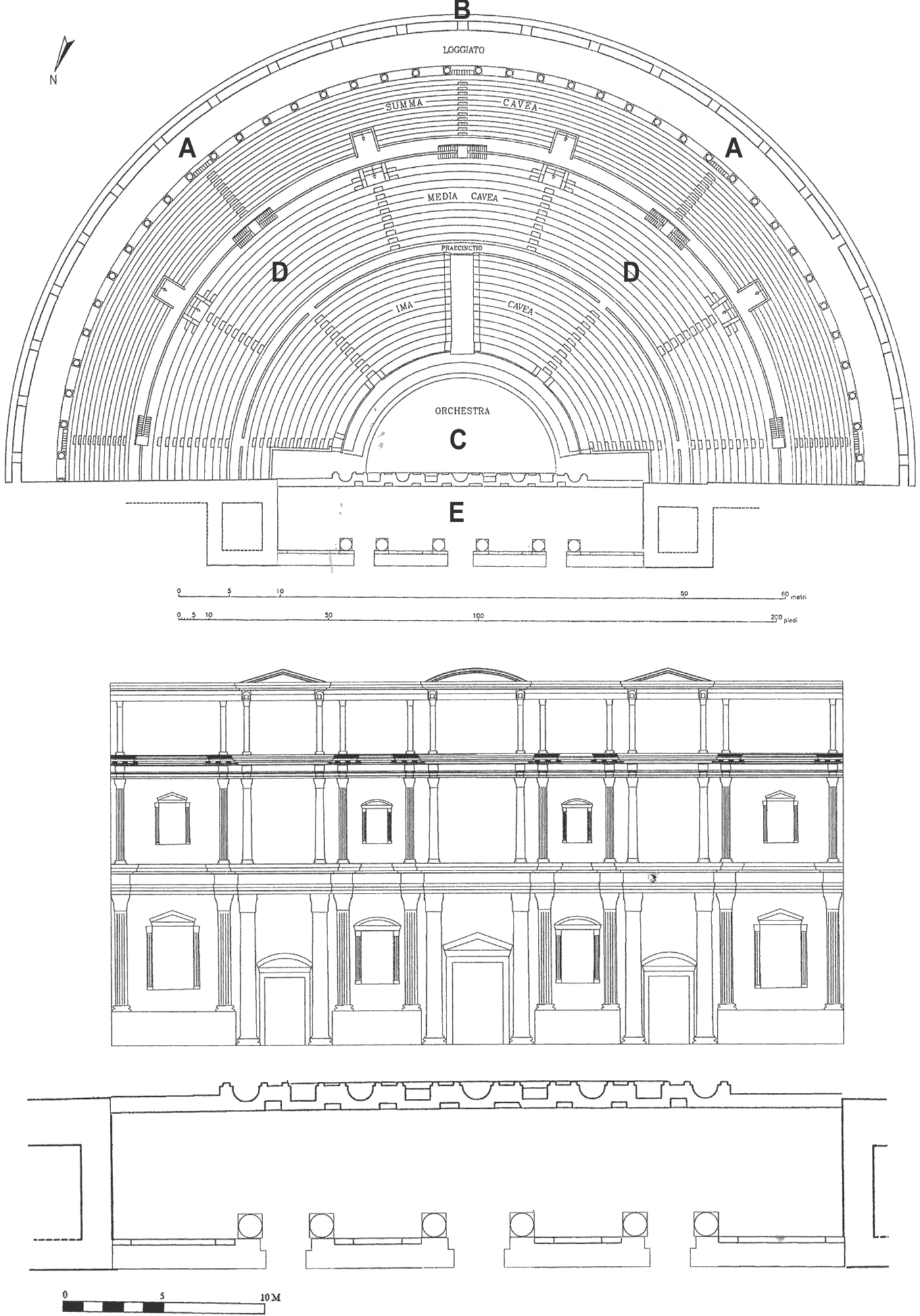 In the late Imperial period, a marble parapet was built to isolate the cavea (stepped seating) (D) from the orchestra during aquatic spectacles.