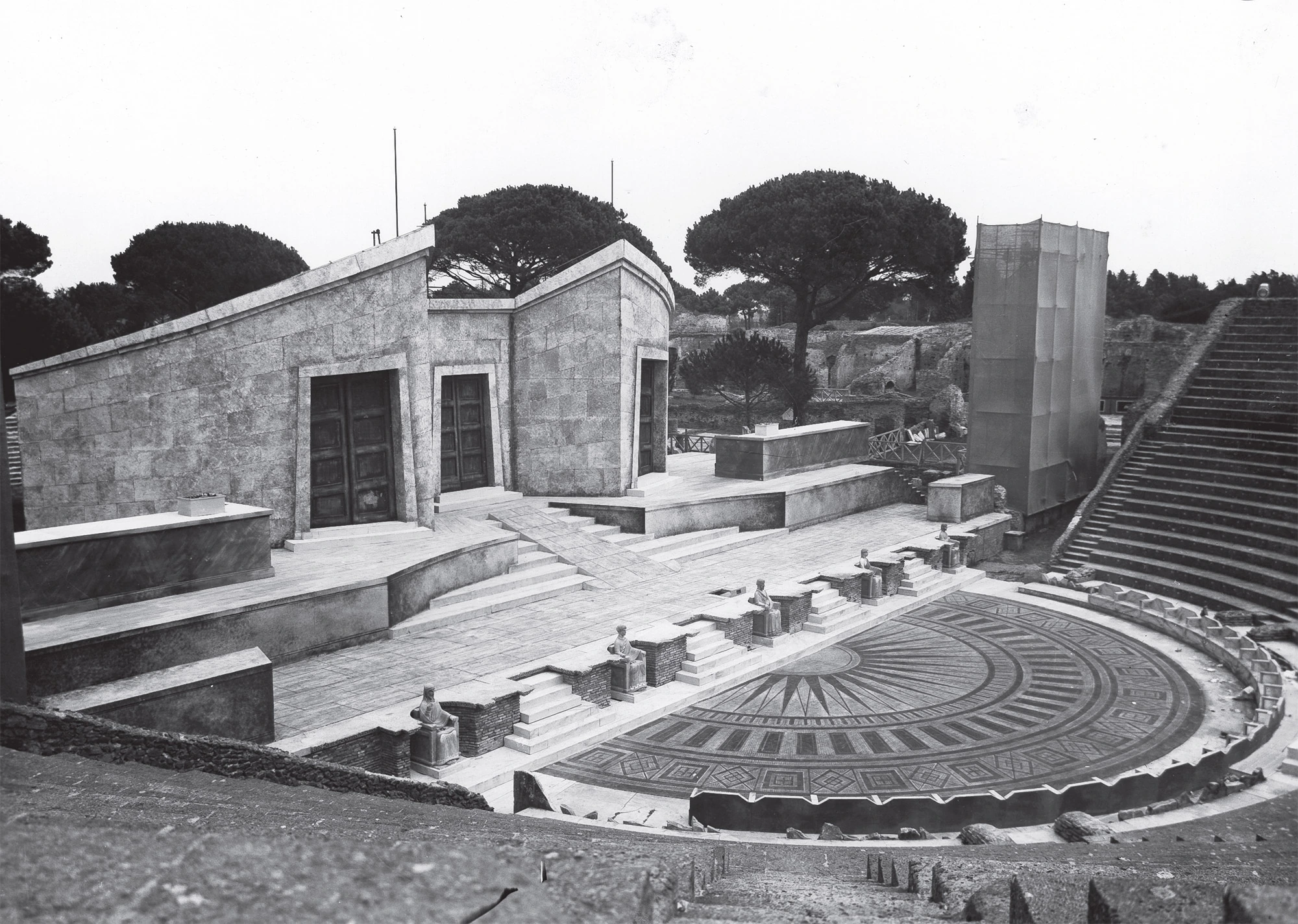 The stage (E) was embellished with niches and some marble decorations (including the theatrical masks) that originally belonged to the stage building still survive.