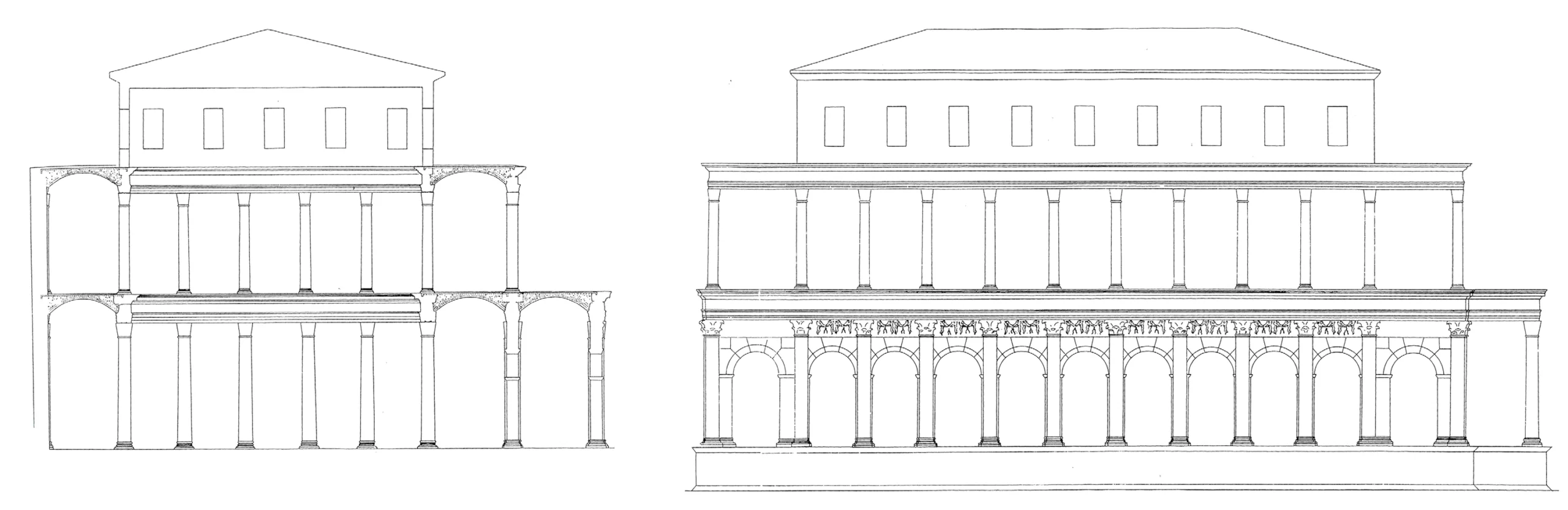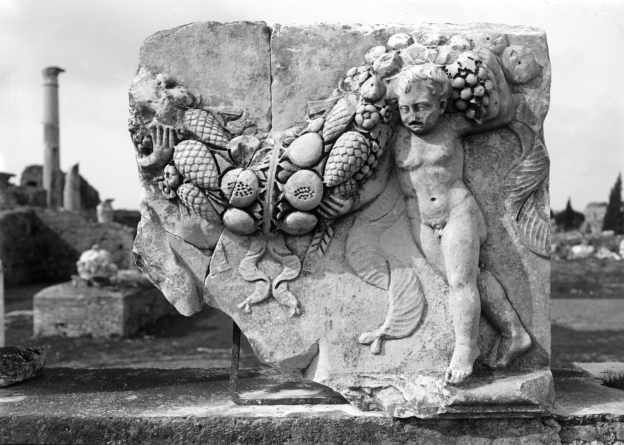 On the east side, the basilica was connected to the Forum square by a visually striking double portico with brick pillars clad in marble and decorated with a frieze with cupids and festoons.