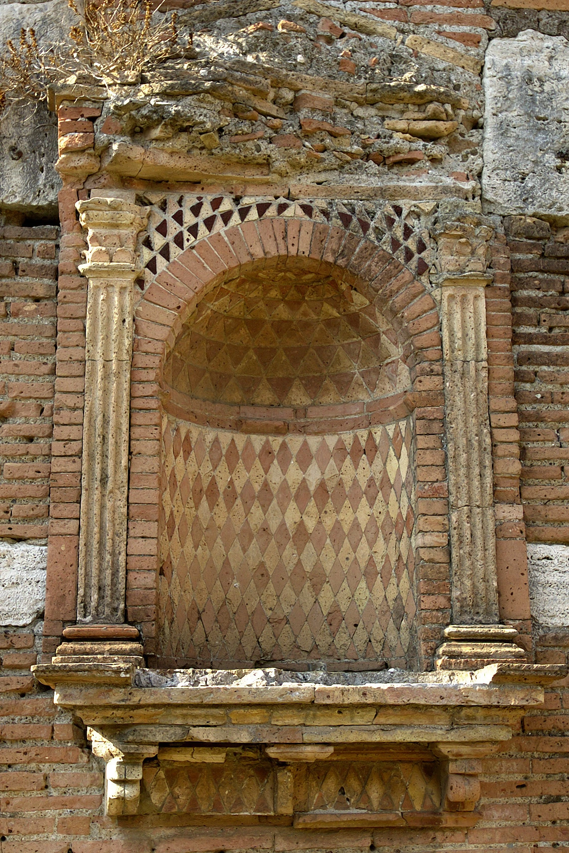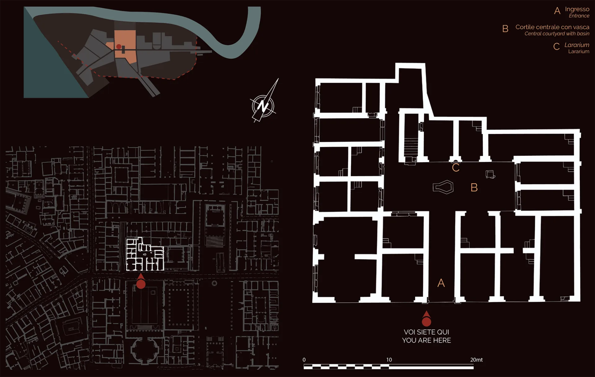 The courtyard was embellished by a polychrome shrine, which can be identified as a lararium (C), a space dedicated to the cult of the gods who protected the household or the community.