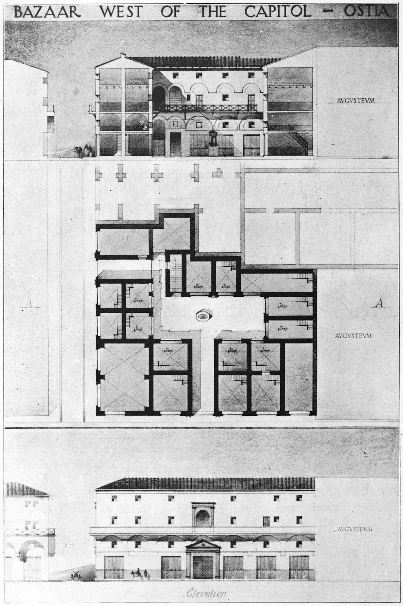 Occupied on the south and west sides by a row of tabernae (shops) facing the street, it was arranged around a central courtyard with a basin and well (B).