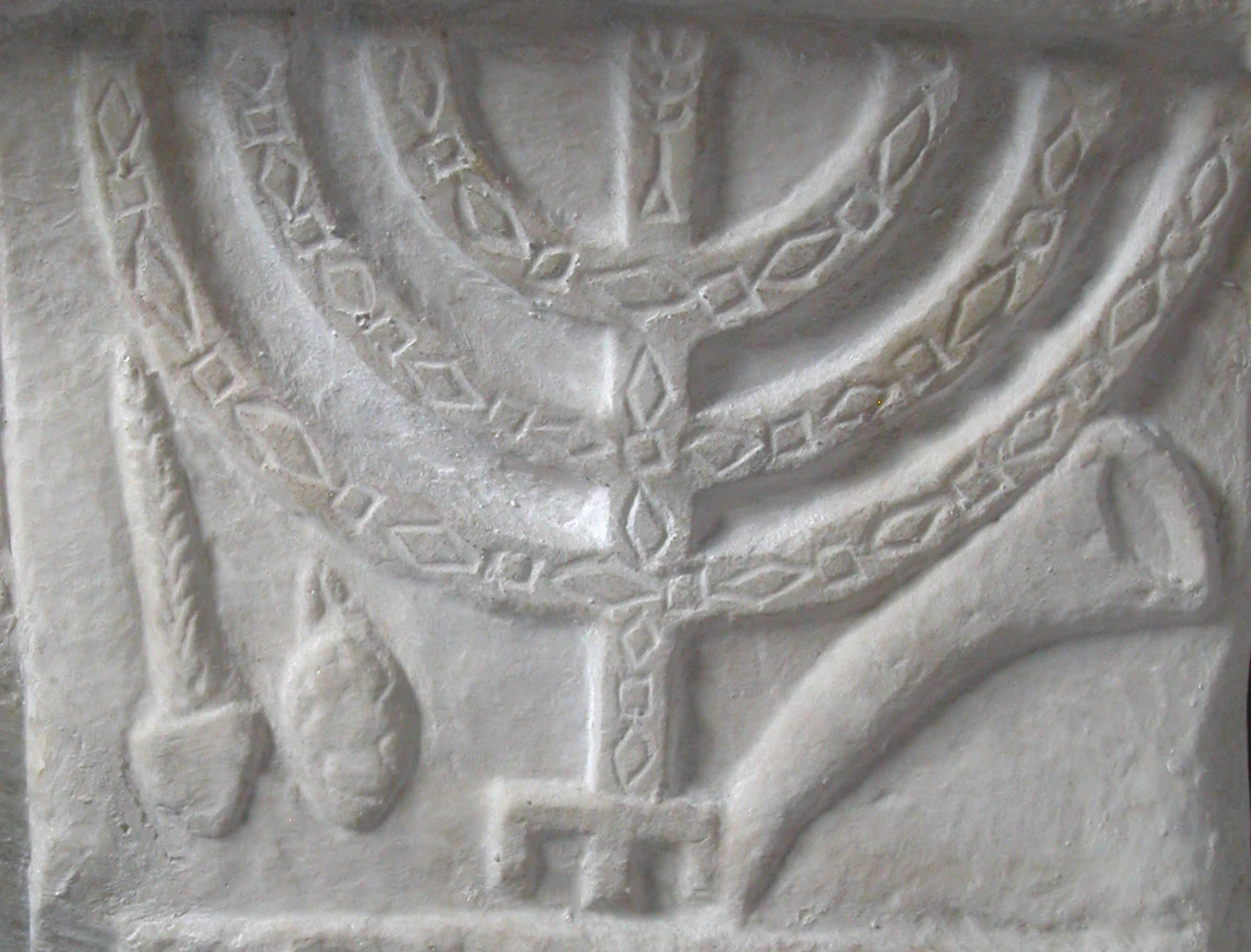 The corbel presents a relief image of the seven-armed candelabrum (menorah), accompanied by a ram’s horn (shofar), a bundle of three species of plant (palm, myrtle and willow) and a citron fruit, important symbols of the Jewish faith that allude to worship at the Temple in Jerusalem and express the hope that it will be rebuilt.