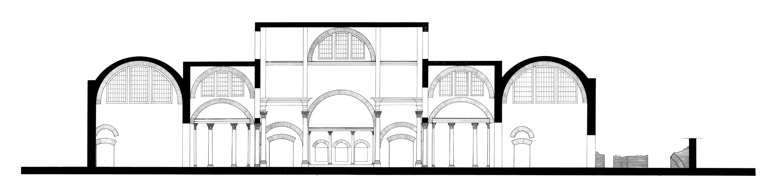 Through the vestibules (B), patrons entered the apodyteria (changing rooms) (C) and a large frigidarium (room with basins for cold baths) (D) with high cross vaults.