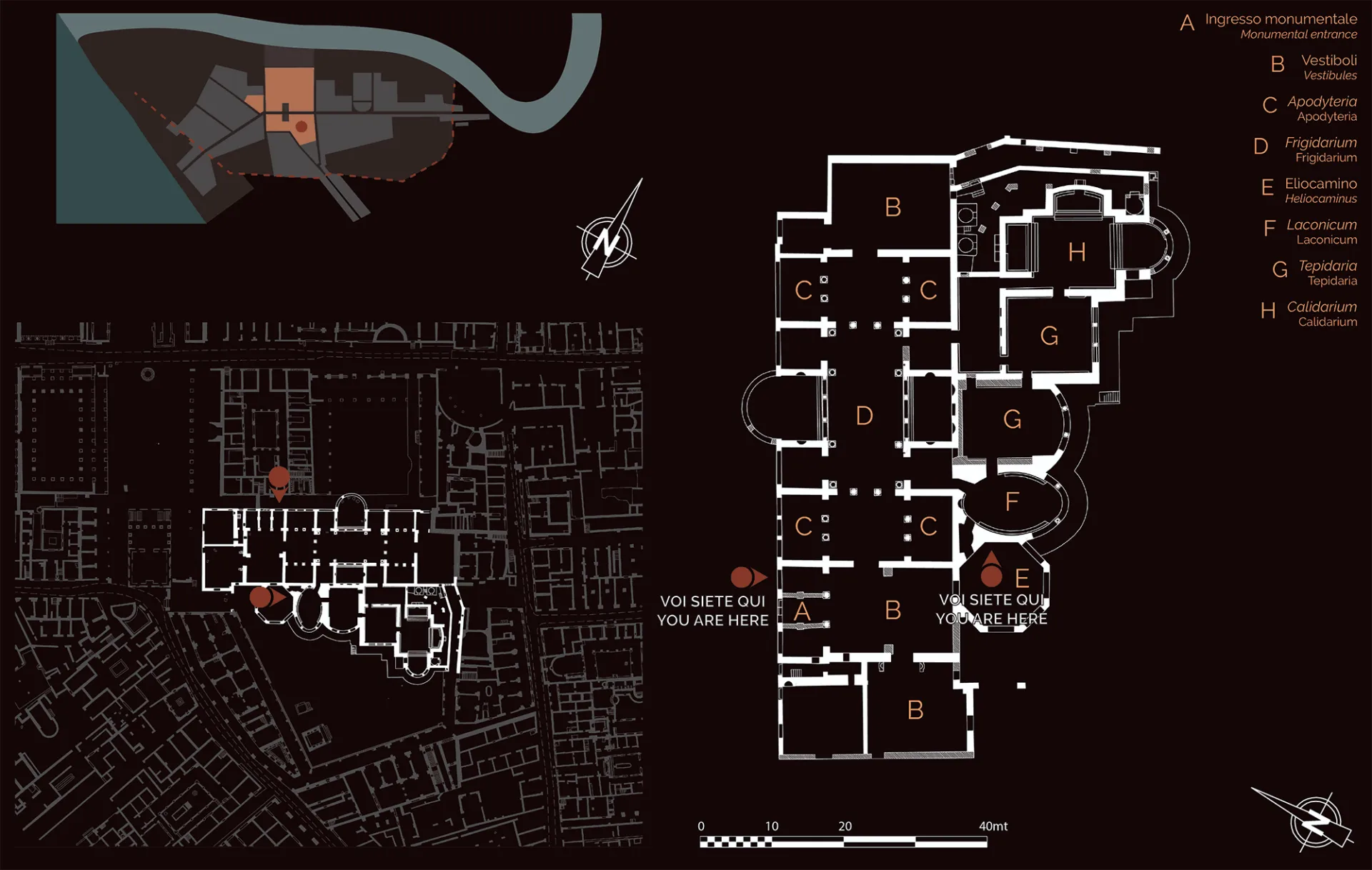 Through the vestibules (B), patrons entered the apodyteria (changing rooms) (C) and a large frigidarium (room with basins for cold baths) (D) with high cross vaults.