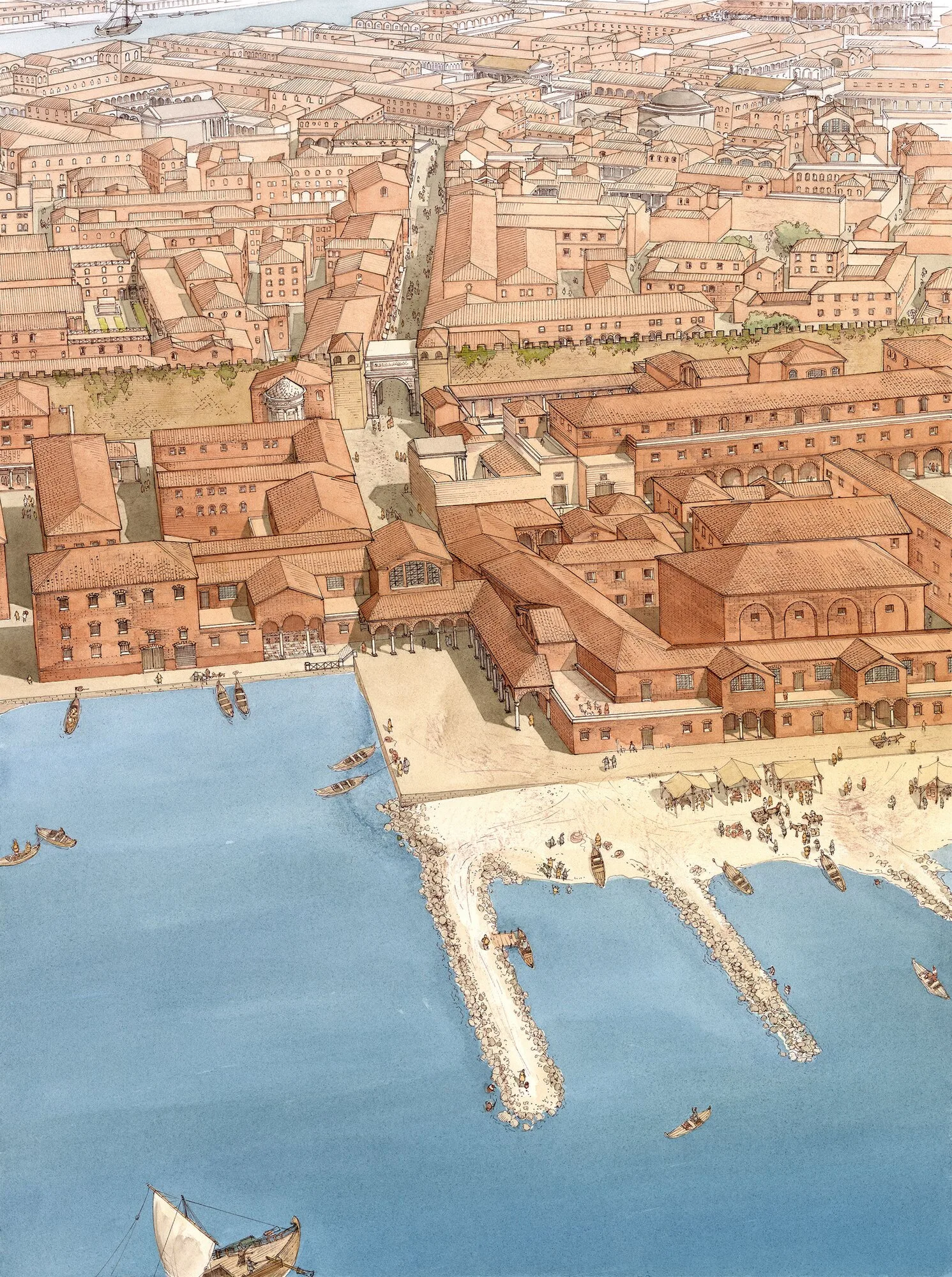The development of this district, encouraged by the construction – perhaps already in the 1st century AD – of an embankment to protect it from the tides, is evidenced by the increasing concentration of residential, commercial and bath complexes during the Imperial period. Among the latter, the Terme di Porta Marina and the Terme Marittime stood out for their size and luxury.