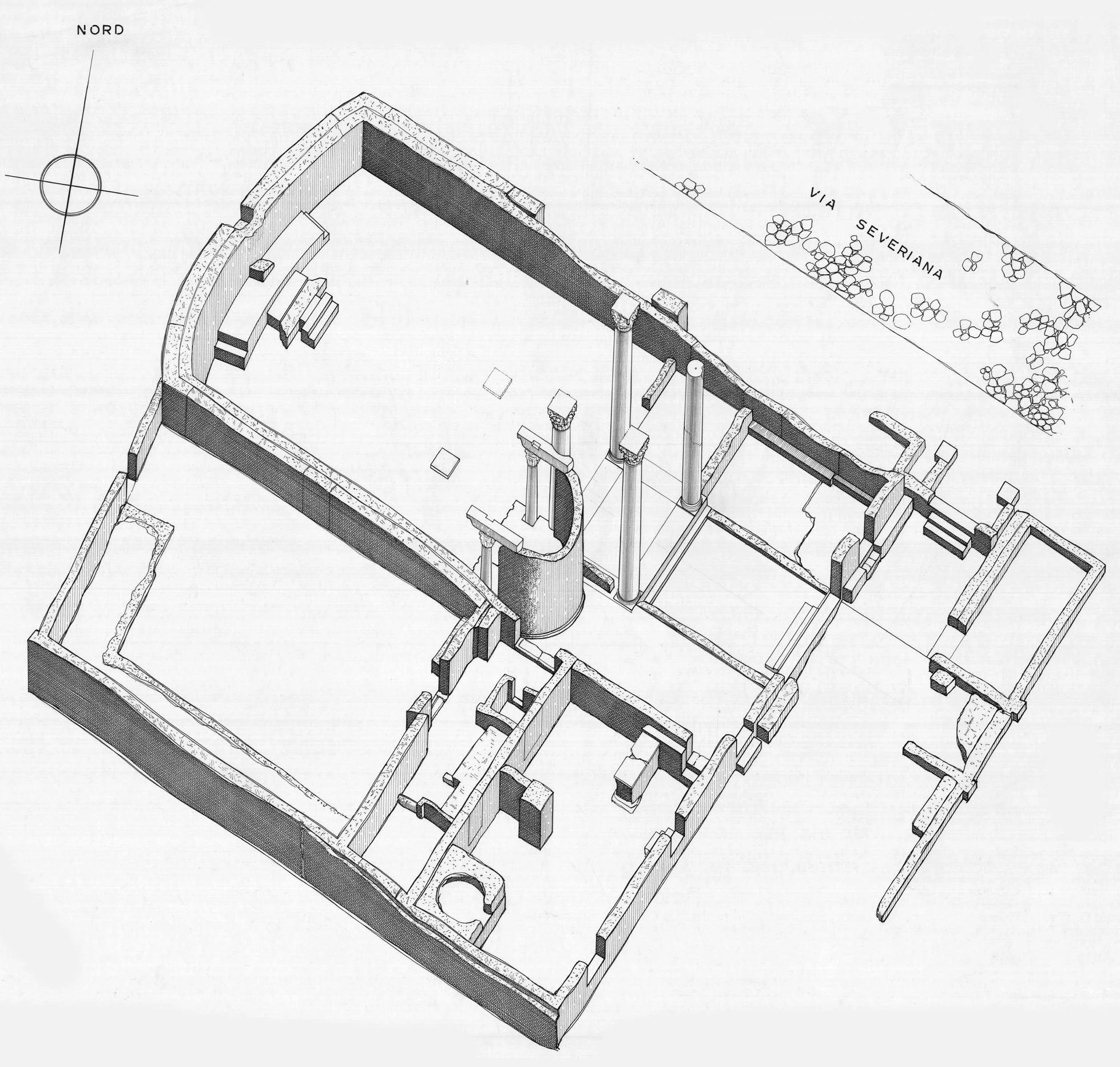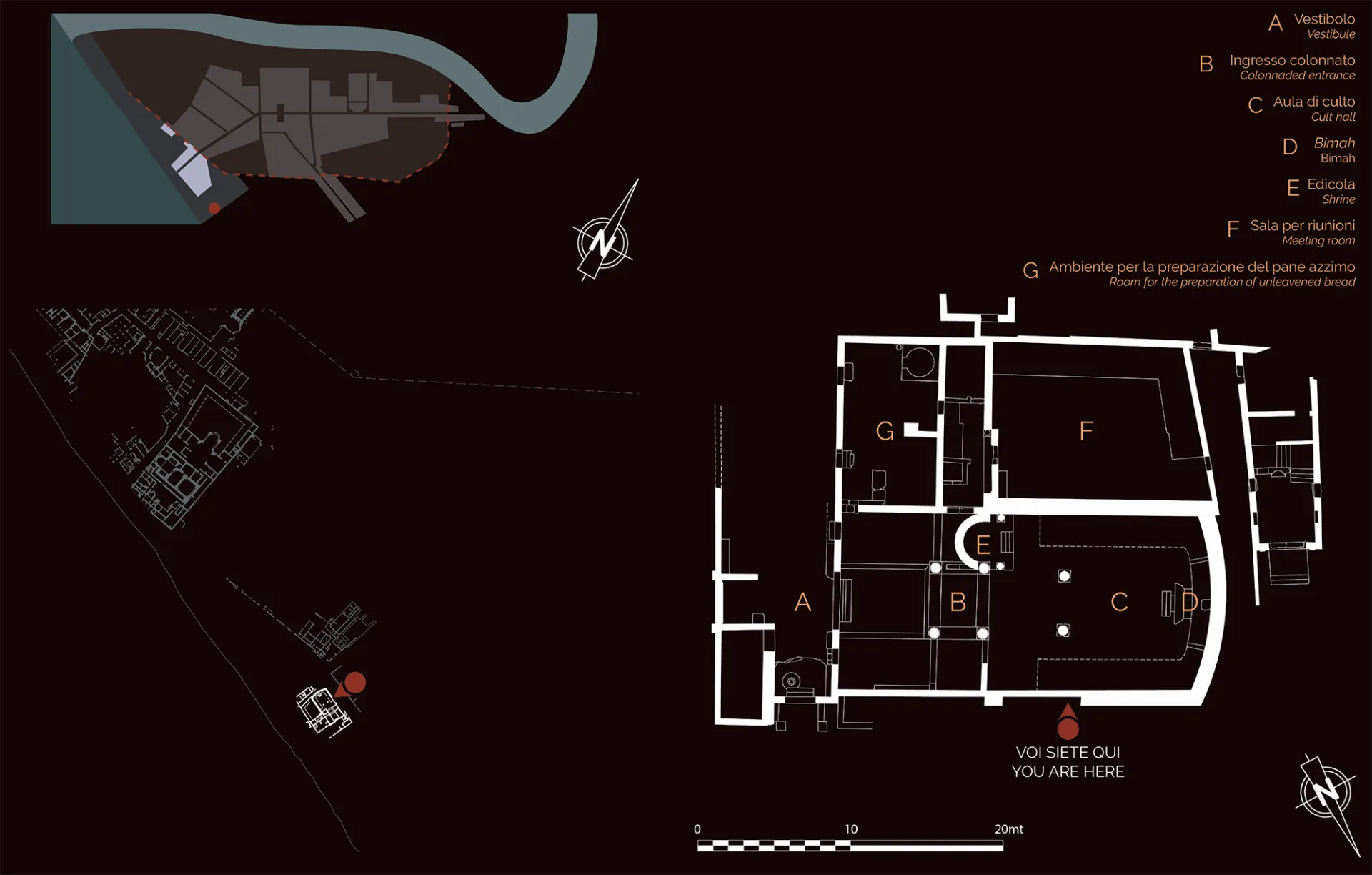 The building, completely reconstructed in the 4th century AD, was accessed through a vestibule (A) that led into the sector reserved for religious functions and prayer.