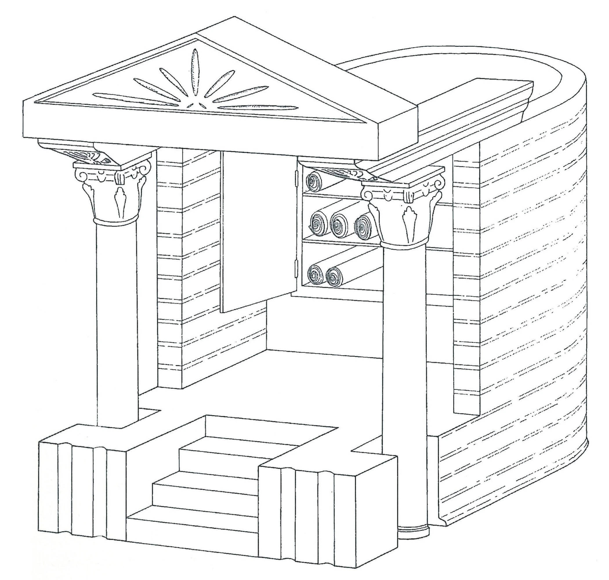The cult hall (C) had a colonnaded entrance (B); at the back was the bimah (D), a raised platform for reading the texts of the Torah (Law), facing towards Jerusalem. On the entrance side of the hall was the apsidal shrine (E) hosting the scrolls of the Torah, surmounted by corbels decorated with the image of the seven-armed candelabrum (menorah).