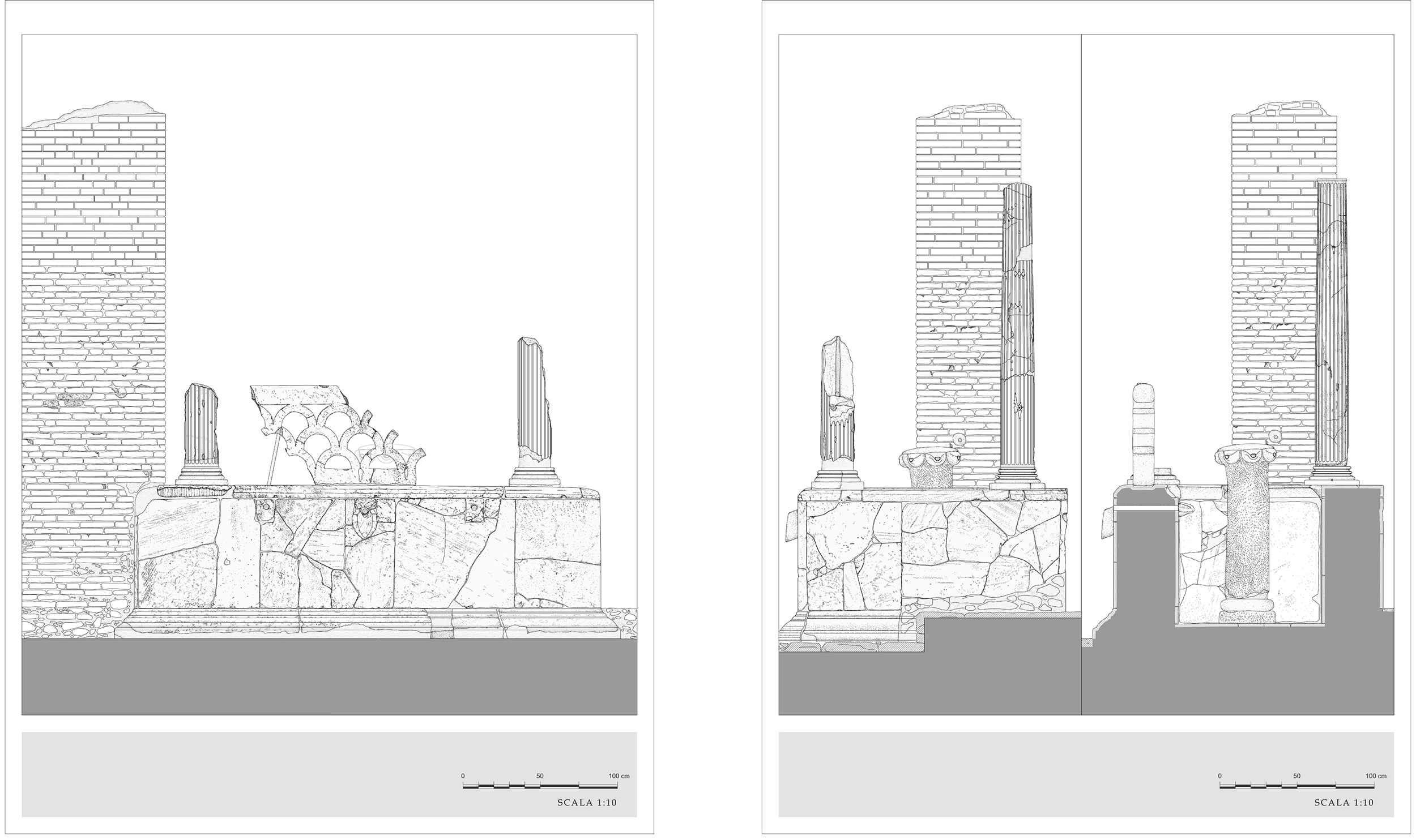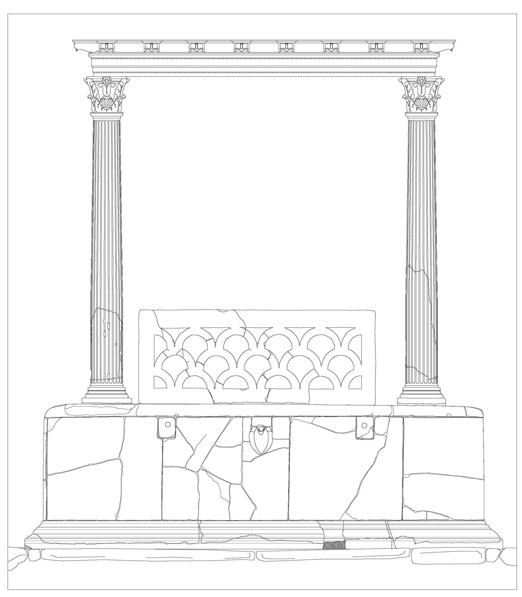 The fountain took the form of a basin decorated with a screen and completely covered in marbles, with columns that may have supported a pergola.