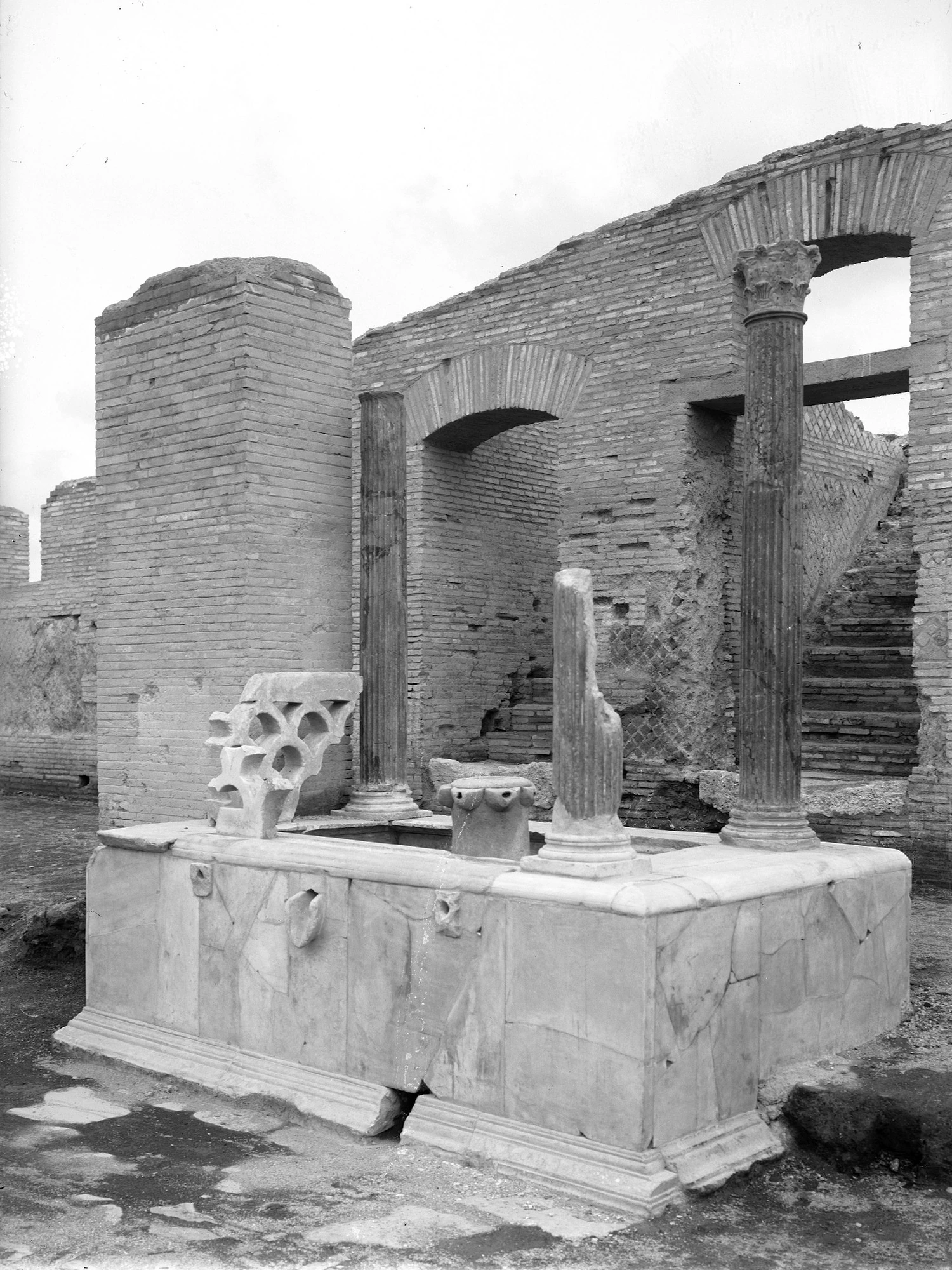 There was probably already a basin lined with hydraulic plaster on this spot from the Augustan period (late 1st century BC – early 1st century AD); the fountain was raised in the Hadrianic period to match the new street level and lined with marble in the 3rd century AD.
