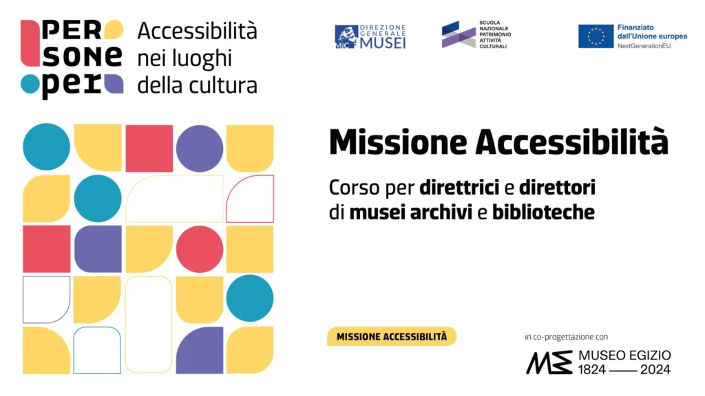 “Missione Accessibilità” è parte di Personeper, il primo piano nazionale di formazione per l’accessibilità nei luoghi della cultura italiani, finanziato dall’Unione europea – NextGenerationEU nell’ambito del PNRR Cultura 4.0, promosso e realizzato dalla Direzione generale Musei del Ministero della Cultura e curato dalla Scuola nazionale del patrimonio e delle attività culturali.