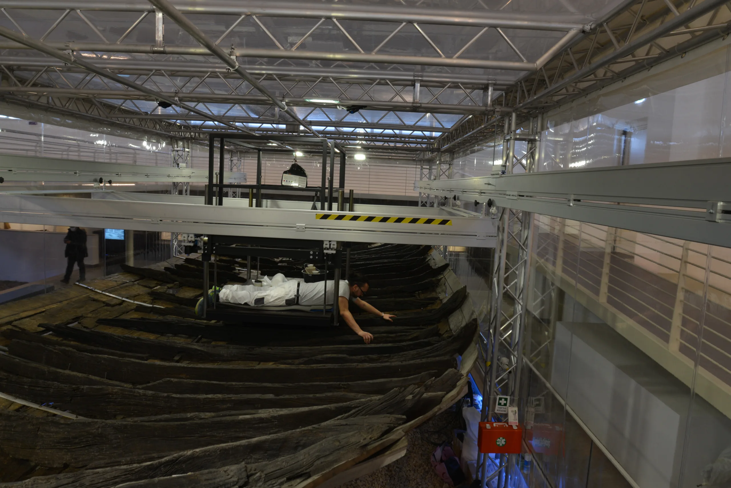 In concomitanza con la riapertura del Museo nel 2021, concepito come work in progress, si è dato il via al restauro delle imbarcazioni, che a quella data, presentavano uno stato conservativo piuttosto critico dovuto a una somma di fattori, che hanno reso indispensabile programmare interventi conservativi. Valore aggiunto di questi restauri è costituito dal fatto che tutte le attività si sono svolte durante l’orario di apertura al pubblico, grazie alla realizzazione di una struttura removibile, in metallo e plastica trasparente, al di sotto della quale operavano i tecnici in assoluta sicurezza, consentendo ai visitatori di assistere alle fasi di restauro; la struttura era dotata di una pedana traslante per consentire ai restauratori di lavorare all’interno delle grandi imbarcazioni. Scopri di più sul restauro, che si è concluso all’inizio del 2025.